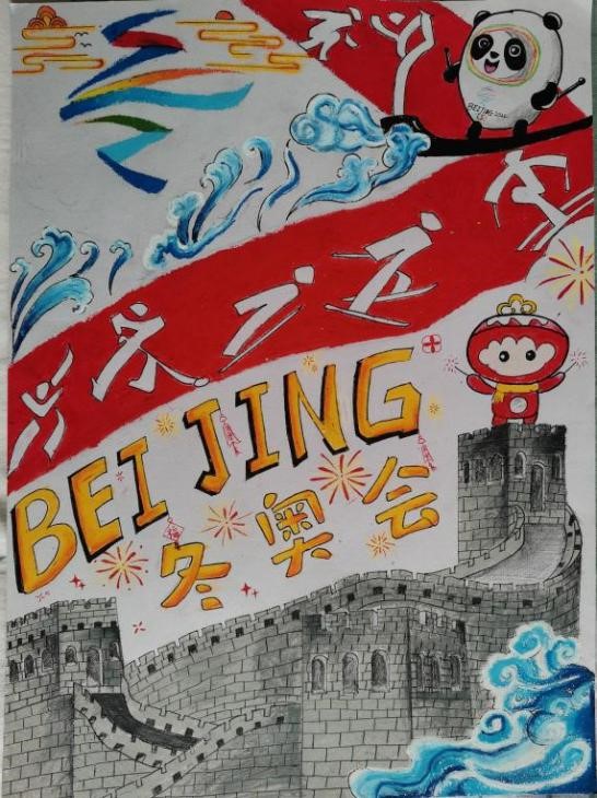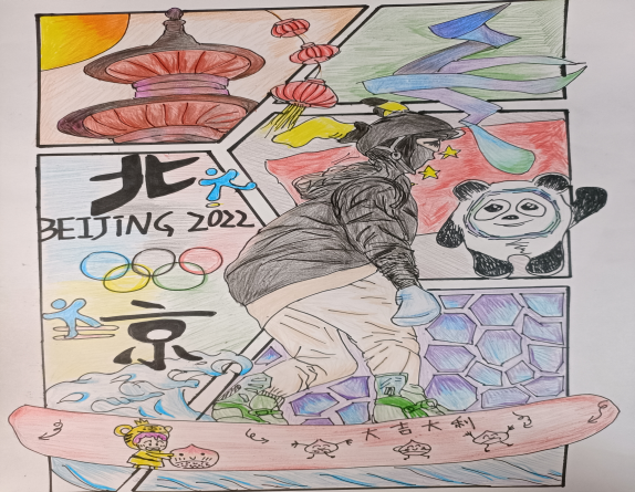 绘画作品精彩层出,缤纷的色彩,独特的构思,刻画出一幕幕冬奥印像。B食品192班的祝晨用水彩描绘了在世界舞台上初露锋芒的冬奥00后的选手们,展现了新时代青年的担当。Z食品191班的王艳潇用彩铅临摹了《激情冬奥》一图,中国龙和海浪分别体现出中华民族团结勇敢,一往无前的精神,中奥运健儿在各个赛事上的缩影,冰墩墩和雪容融集聚一堂助力奥运。B海洋213郁傲男用手抄报的形式,展现了本次冬奥会中国作为东道主的更快、更高、更强、更团结的奥林匹克格言的中国方案。
