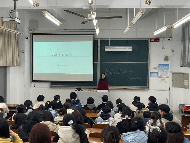 2023年3月2日18时30分,B食品211,212全体员工在知达楼206教室集中,参加了以“2021级食品见面会”为主题的班会活动。公司新任兼职辅导员、博士胡悦老师主持。