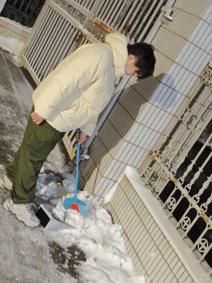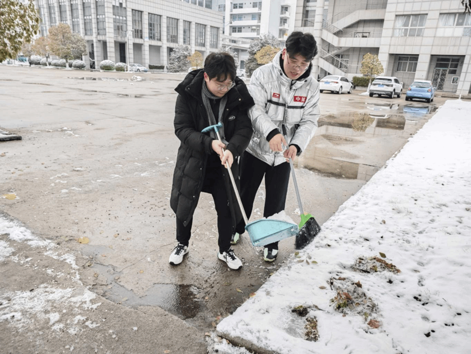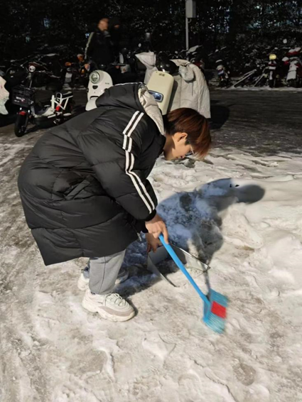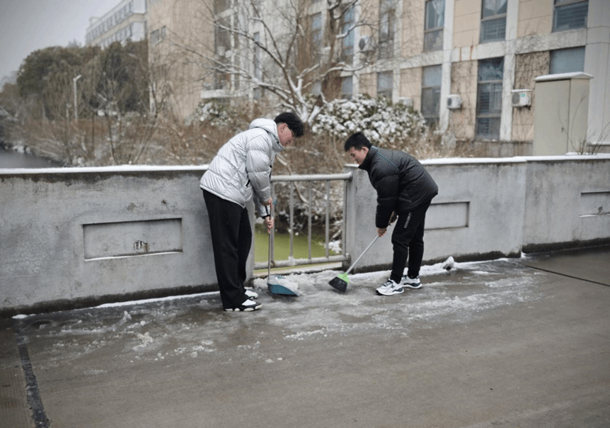 参加本次志愿活动的B海洋213班孙家孝同学说道:“刚到公司就欣赏到了我们盐工别样的美,但是发现校园道路上的积雪混合雨水致使道路结冰,非常危险,就发动身边的同学们一起帮忙,清扫道路积雪。”王施雄同学说:“路面结冰打滑,大家走路都是小心翼翼,开学人流量很大,就想着能清一片是一片,大家出行都安全点”。