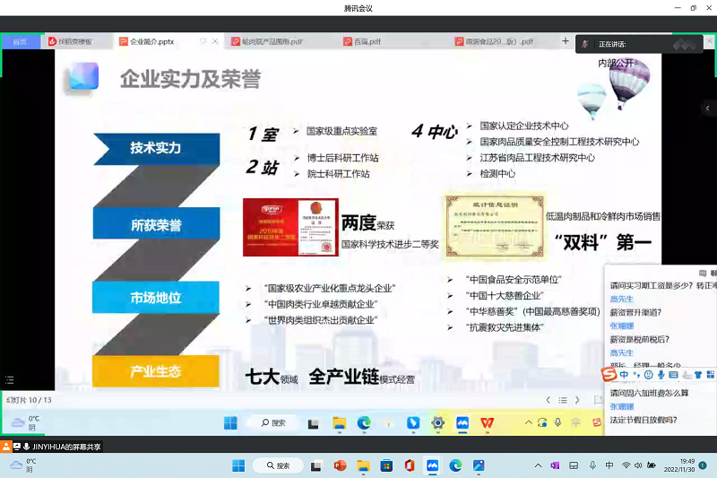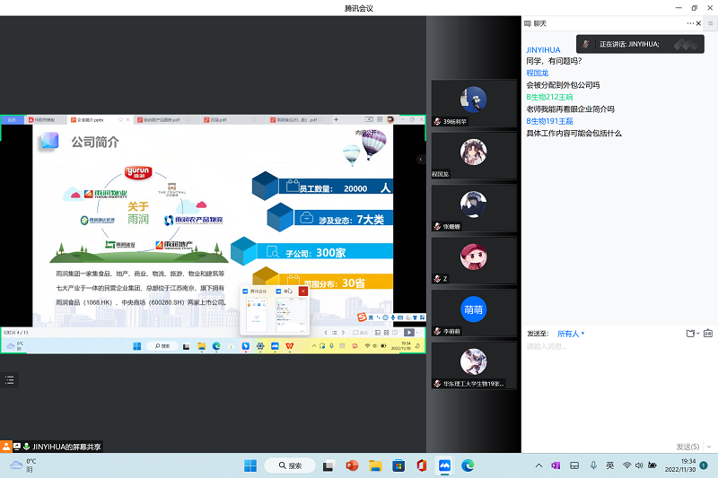 2022年11月30日,在建军东路校区williamhill大会议室,雨润集团召开线上专场招聘会,公司2022届20余名应届毕业生参加此次招聘会。
