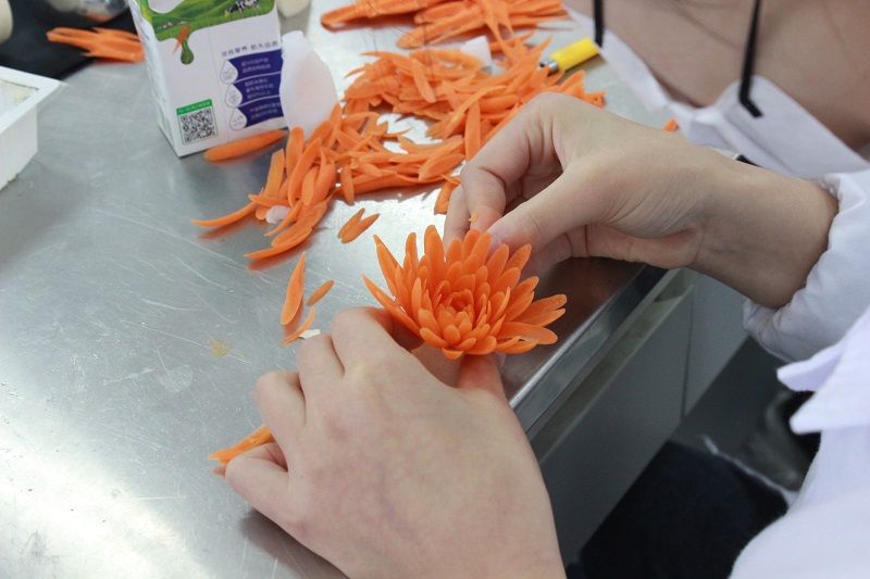 11月26号,决赛在北校区知达楼食品工艺学实验室进行。参赛选手纷纷大显身手,各个团队成员分工明确,切菜、烹饪、摆盘、做造型,不亦乐乎。决赛的评审员由5位教师评审与10位大众评审组成,根据菜品色泽、香味、味感、形态、质感、创意等6个方面对参赛作品打分。