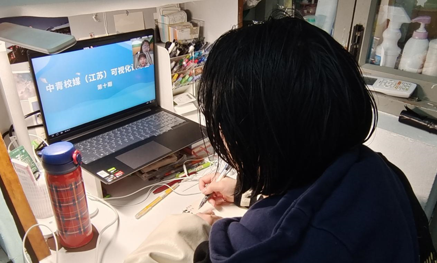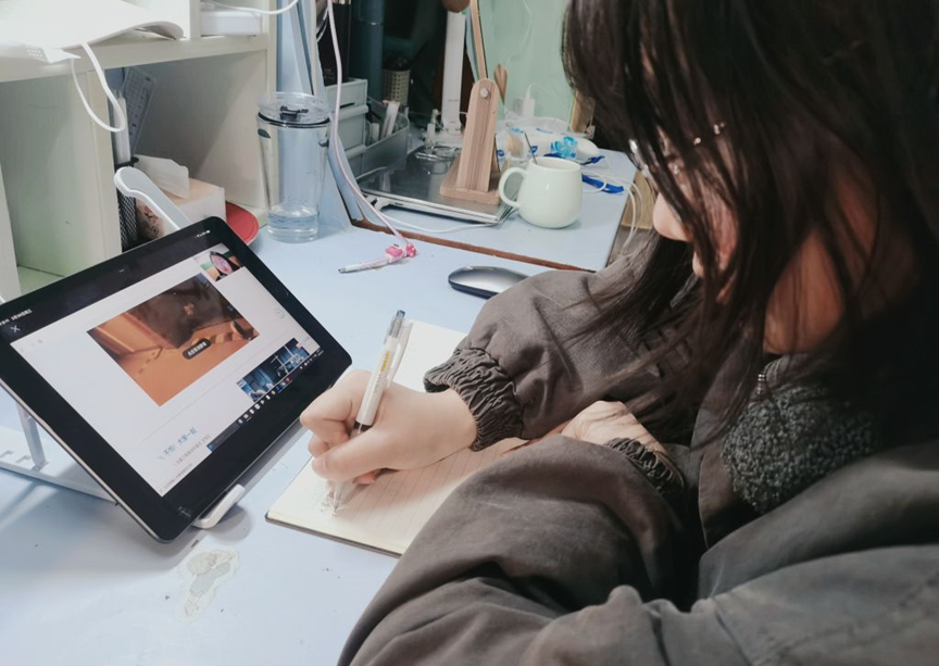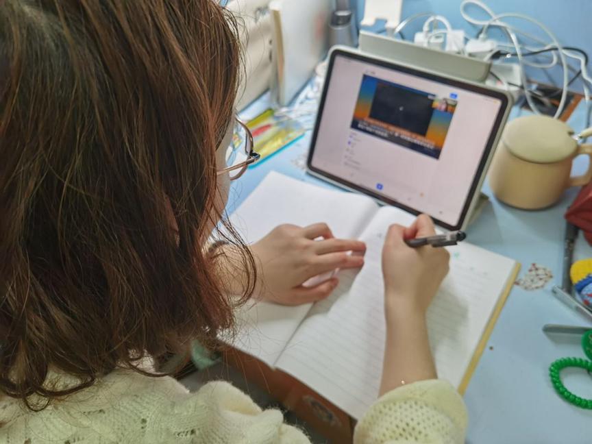 在直播课上,同学们仔细听讲,认真地记录听课笔记。员工干部王聪聪为同学们提供了关于新闻内容的结构与布局方面的技巧,帮助优化同学们撰写的新闻整体观感。