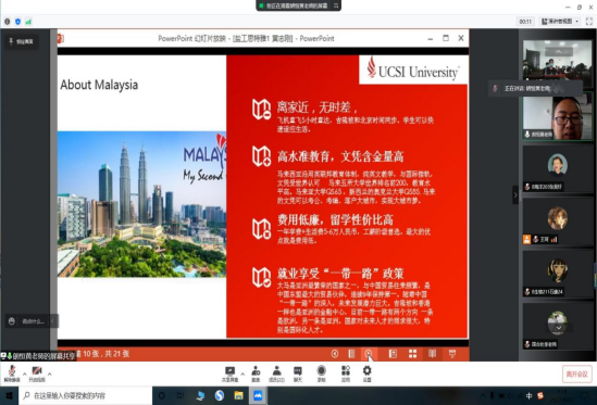 4月27日上午,williamhill在公司会议室举办海外留学硕士项目宣讲会,邀请国际交流与合作处国际教育科科长闫桥静、项目负责人李景玉两位老师线上主讲,为员工介绍英国、澳大利亚、马来西亚与韩国的相关硕士项目。党总支副书记毕蕾主持,团委副书记王珂,公司大三、大四的员工约100人线上线下参加。