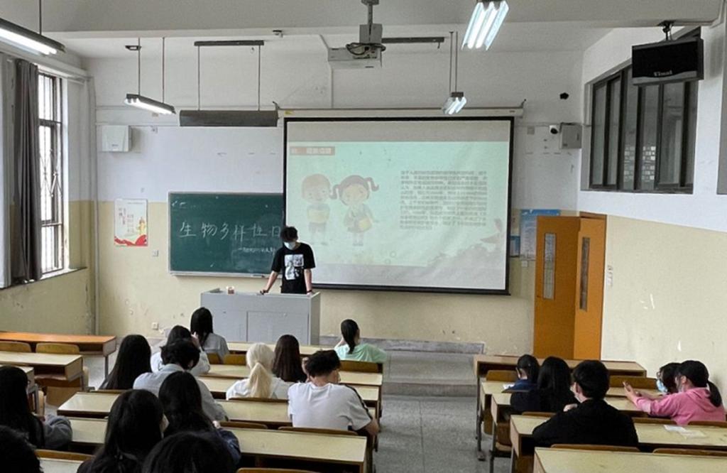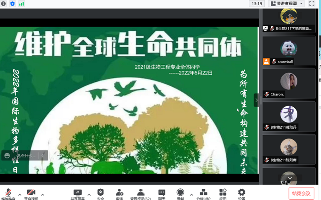 生物212班的班长查志伟通过线下班会的形式介绍了生物多样性的重要意义,并鼓励同学们认识身边生物的多样性,了解自然生物界的缤纷富饶,用自己的实际行动为维护生物多样性添砖加瓦。朱凯伦同学说“使用共享单车出行,就餐倡导光盘行动,积极落实垃圾分类、节能减排,从自身做起,在一件件的小事中为维护世界生物多样性贡献自己的一份力。”各班还通过线上班会的形式共同观看生态环境部发布的2022年国际生物多样性日宣传片《共建地球生命共同体》, 将室外的莺歌鸟语花香搬到每一位同学面前。