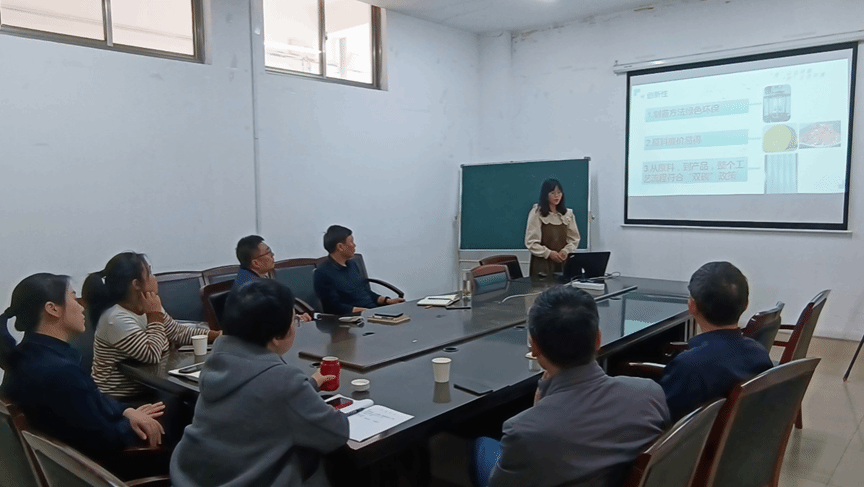 会上,《双碳政策下的新型全生物降解保鲜膜》和《基于软包电池热失控限制的新型膜材料》两个项目负责同学通过PPT讲解和视频播放的方式,围绕作品项目背景、技术工艺、主要创新点及现实意义等方面作了了详细汇报,介绍了已经开展工作情况和存在的困难。