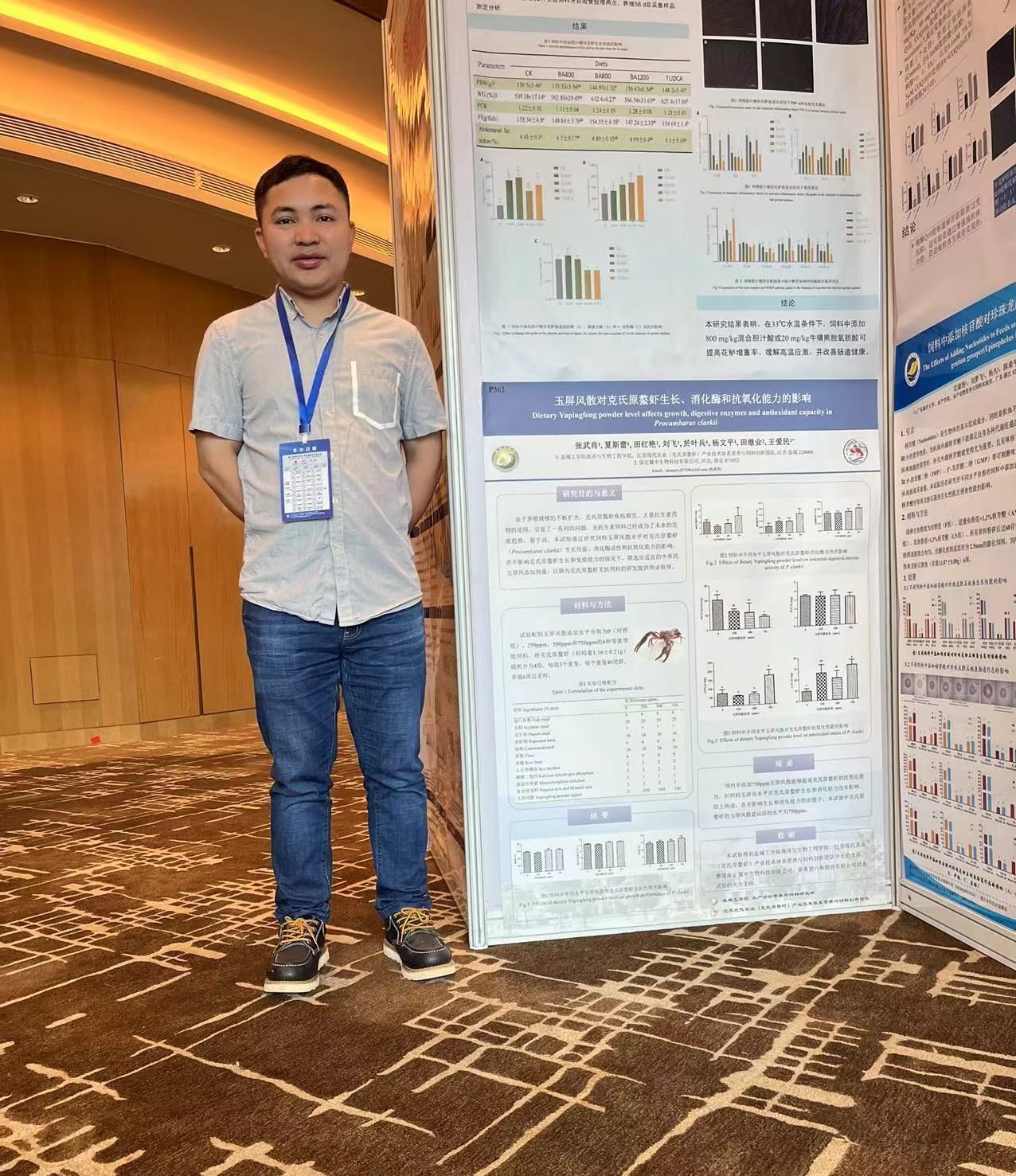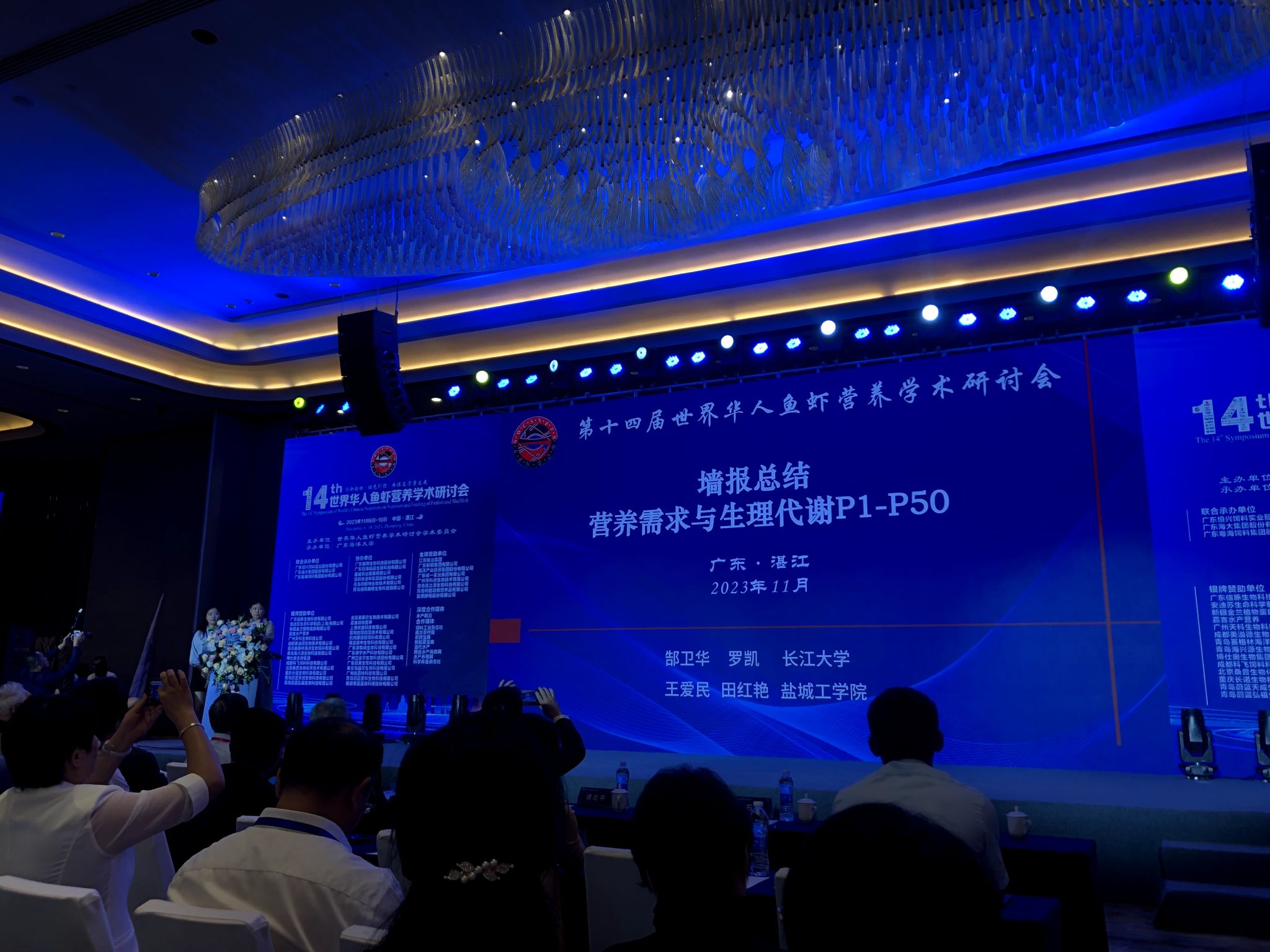 张武肖、胡长东和李敖同学在大会上分别展出题为《玉屏风散对克氏原螯虾生长、消化酶和抗氧化能力的影响》、《饲料中添加糖萜素对克氏原螯虾生长性能、肌肉抗氧化能力和品质的影响》和《不同粒径开口饵料对克氏原螯虾生长性能与营养组成的影响》的三个墙报,其中张武肖老师指导李敖制作的墙报荣获本届世华会“优秀墙报奖”。闭幕式上,田红艳副教授作为代表对“营养需求与生理代谢”版块墙报进行点评。