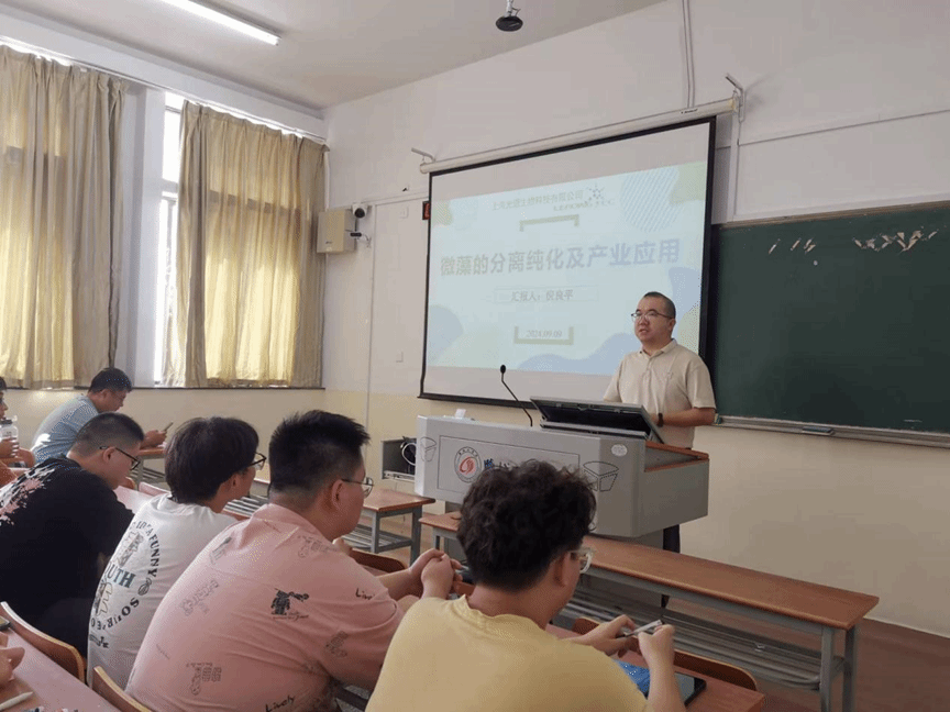 课堂上,倪良平总经理,以《微藻的分离纯化及产业应用》为题,从光合作用切入,生动地将参与光合作用的藻类划分为“蛋鸡型藻类”和“肉鸡型藻类”,并详细介绍两种藻类在微藻产业化发展中的作用。为了更好的让同学们明白《藻类学》《海洋浮游生物学》课程的实际应用价值,倪良平和同学一起重温了课程中藻类分离纯化内容。他强调,藻类分离纯化技术是手眼心的统一,是用毛细针管在显微镜下从数以百计的藻细胞吸取出来一株5-6微米的目标藻,并进行单独培养的过程。如果同学们掌握了这项普通的技术,在任何藻类培养公司都有立足之地。此外,倪良平还分享了自己在产品研发推广过程中的感悟、见闻。