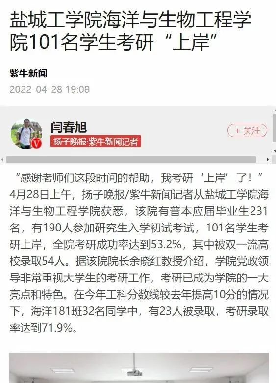 海洋科学类专业就业领域非常广泛,需要多学科的人才。因此,作为海洋科学专业的毕业生,占有一定的专业优势。近3年来,两个专业的毕业生考取研究生比率达50%以上,考取院校主要有中国科公司大学、南京大学、厦门大学、中国海洋大学、南京农业大学、南京师范大学、苏州大学、上海海洋大学等,毕业生主要面向海洋生物制品企业、海洋生物资源增养殖企业及海洋管理等相关单位就业。